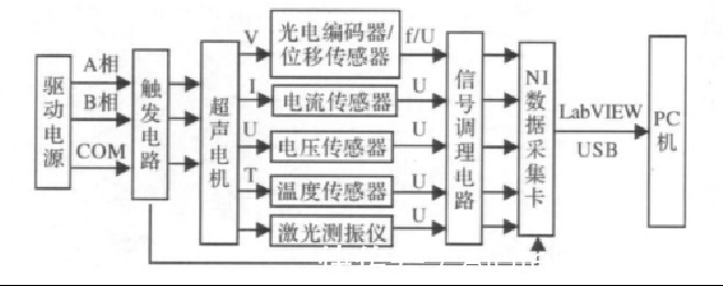 超声电机是以高压放大器驱动压电陶瓷的逆压电效应而激发的超声振动作为驱动力,靠振动部分和移动部分之间的摩擦力耦合转换成移动体的旋转或者直线运动的新型电机。超声电机检测与分析系统由超声电机,传感器,调理电路,数据采集卡,计算机处理系统等组成。传感器的作用是将电机运行输出的速度、温度等物理信号转换成电信号。调理电路是对电信号进行放大、滤波、隔离等处理,是衔接传感器与数据采集卡的中间环节。