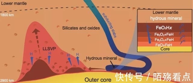 俯冲板中的含水矿物(蓝色)携带水与铁芯反应形成富氧多层块(深棕色)。反应过程中形成多层富氧层,氢从这一系列的化学反应中逸出并上升以维持氢循环。富氧多层块横向移动并累积。一些富氧多层块(小块)被分散并与地核和地幔交界面的硅酸盐和氧化物混合。